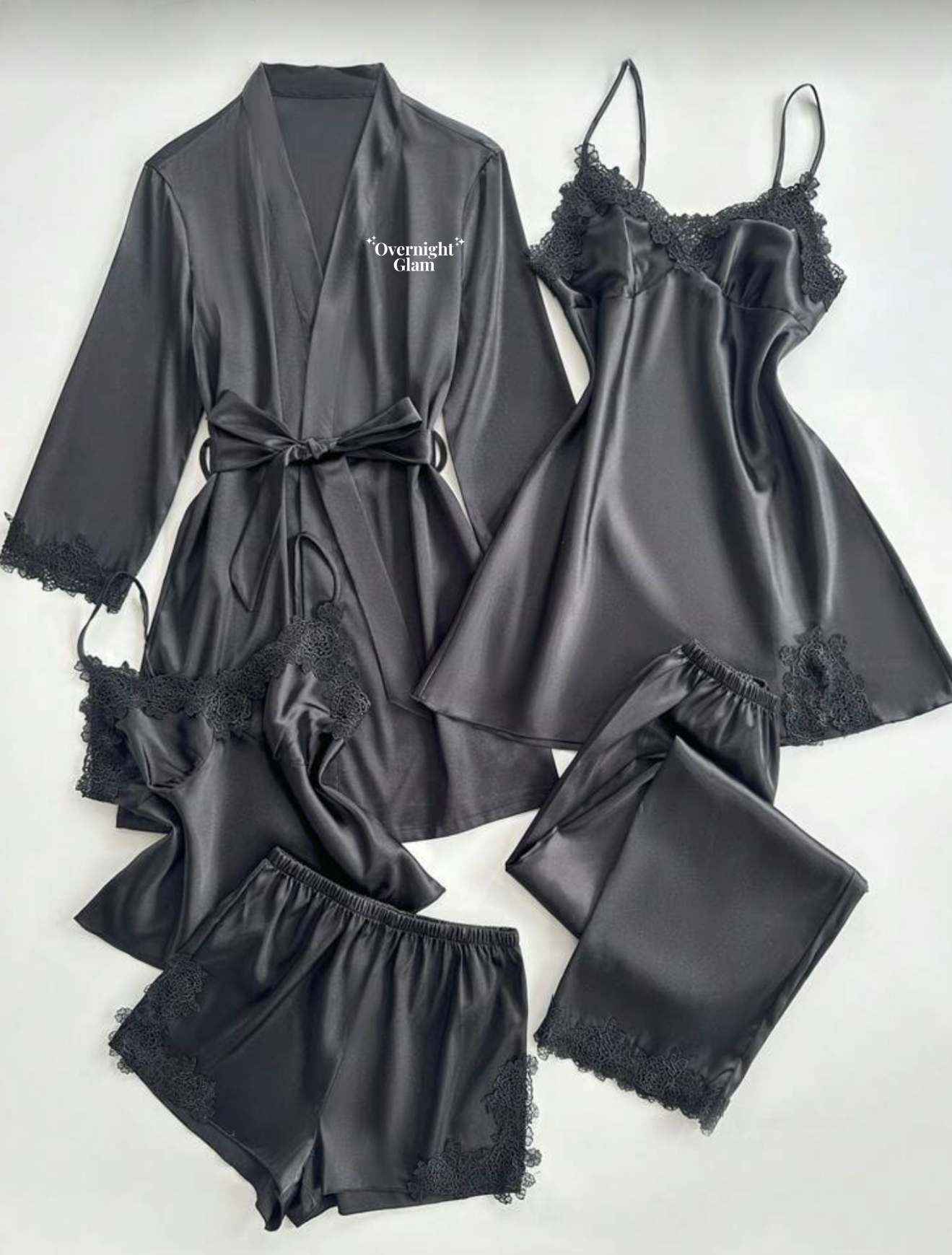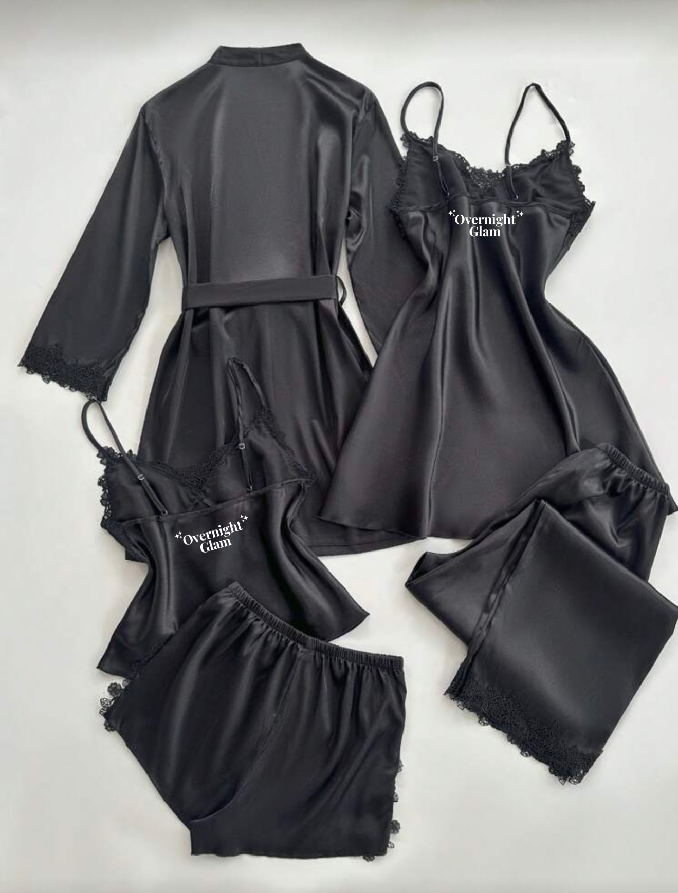 Crafted from silky-soft satin with delicate lace detailing, this 4-piece set moves with you — whether you’re winding down, sleeping, or slow-starting your morning. Lightweight, breathable, and gentle on skin and hair, it’s perfect for beauty sleep without sacrificing comfort.